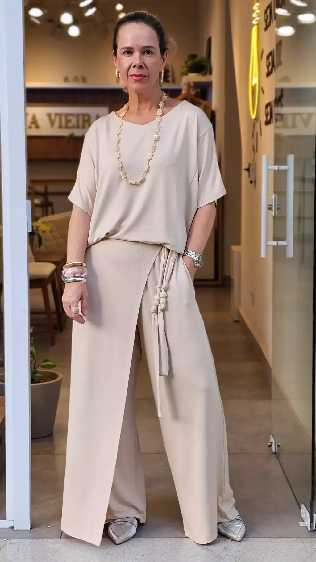 Calça Xangai produzida em malha premium Vicenza( com leve textura), trespassado como um pareô e amarração que contém no cordão do mesmo tecido, com lindas contas que dão um super estilo a calça, bolsos faca. Tamanho único mas veste perfeitamente até 44/46.