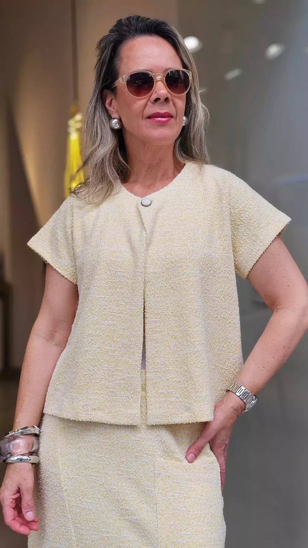 Conjunto em tecido texturizado tipo tweed com elastano, Blusa com lindo botão para fechamento. Saia com elastico na cintura, bolso frontal e fenda cruzada frontal. Super estiloso e elegante!